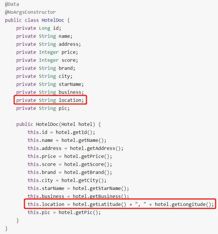 @Data @NoArgsConstructor public class HotelDoc { private Long id; private String name; private String address; private Integer price; private Integer score; private String brand; private String city; private String starName; private String business; private String location; private String pic; public HotelDoc(Hotel hotel) { this.id = hotel.getId(); this.name = hotel.getName(); this.address = hotel.getAddress(); this.price = hotel.getPrice(); this.score = hotel.getScore(); this.brand = hotel.getBrand(); this.city = hotel.getCity(); this.starName = hotel.getStarName(); this.business = hotel.getBusiness(); this.location = hotel.getLatitude() + ", " + hotel.getLongitude(); this.pic = hotel.getPic(); } }