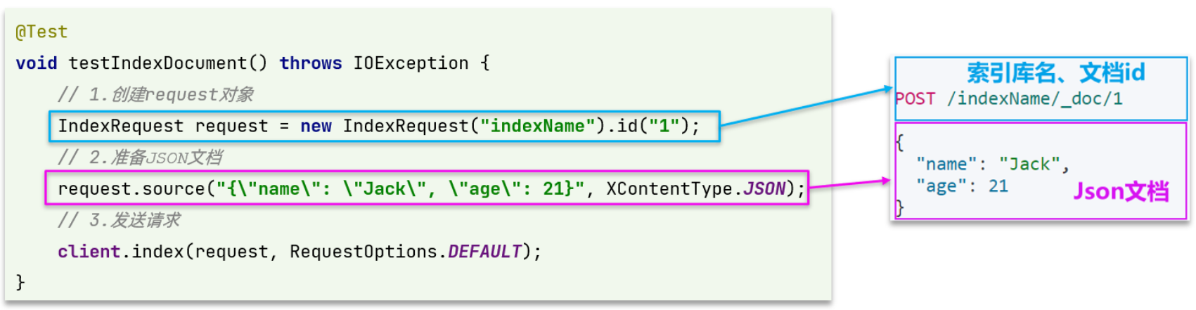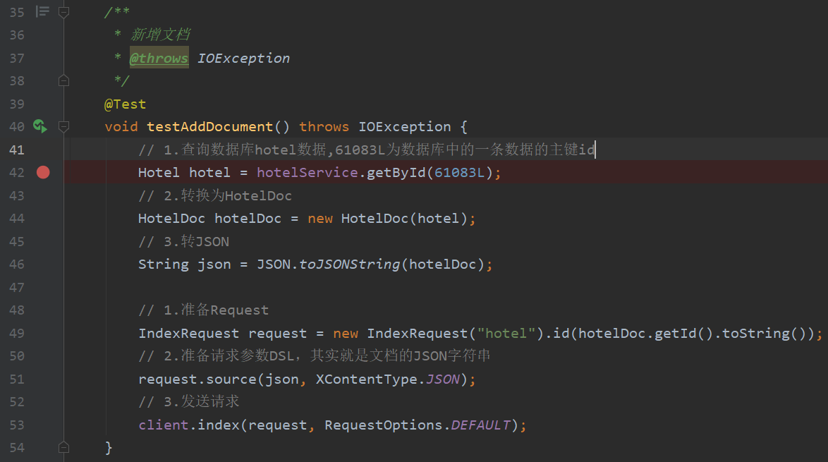 @Test void testAddDocument() throws IOException { // 1.根据id查询酒店数据 Hotel hotel = hotelService.getById(61083L); // 2.转换为文档类型 HotelDoc hotelDoc = new HotelDoc(hotel); // 3.将HotelDoc转json String json = JSON.toJSONString(hotelDoc); // 1.准备Request对象 IndexRequest request = new IndexRequest("hotel").id(hotelDoc.getId().toString()); // 2.准备Json文档 request.source(json, XContentType.JSON); // 3.发送请求 client.index(request, RequestOptions.DEFAULT); }