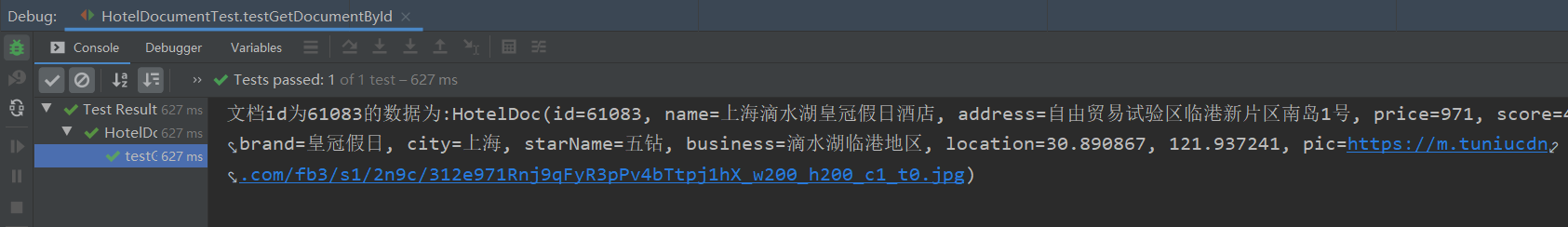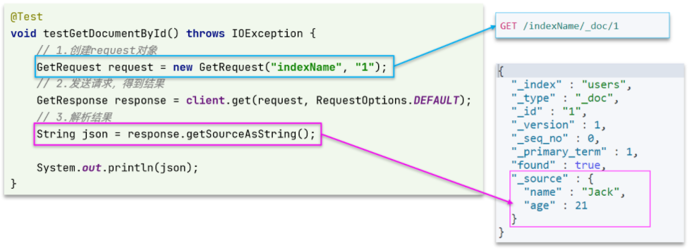 1 /** 2 * 根据文档id查询数据 3 * @throws IOException 4 */ 5 @Test 6 void testGetDocumentById() throws IOException { 7 // 1.准备Request // GET /hotel/_doc/{id} 8 GetRequest request = new GetRequest("hotel", "61083"); 9 // 2.发送请求 10 GetResponse response = client.get(request, RequestOptions.DEFAULT); 11 // 3.解析响应结果 12 String json = response.getSourceAsString(); 13 14 HotelDoc hotelDoc = JSON.parseObject(json, HotelDoc.class); 15 System.out.println("文档id为61083的数据为:" + hotelDoc); 16 }