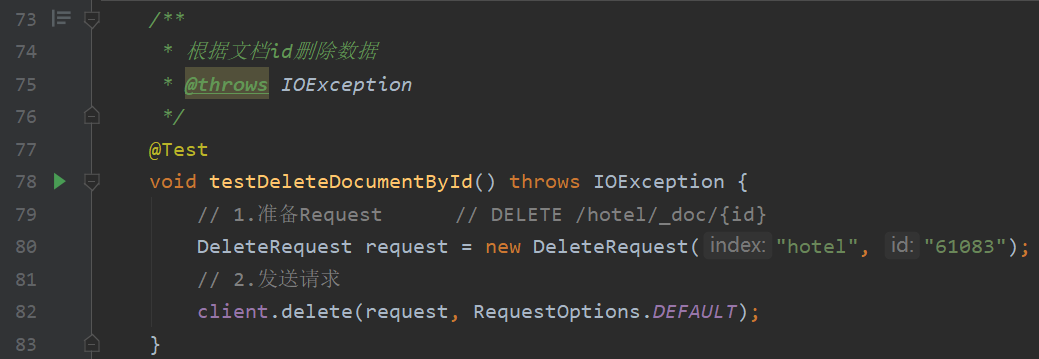 1 /** 2 * 根据文档id删除数据 3 * @throws IOException 4 */ 5 @Test 6 void testDeleteDocumentById() throws IOException { 7 // 1.准备Request // DELETE /hotel/_doc/{id} 8 DeleteRequest request = new DeleteRequest("hotel", "61083"); 9 // 2.发送请求 10 client.delete(request, RequestOptions.DEFAULT); 11 }