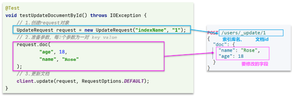 1 /** 2 * 根据文档id修改数据 3 * @throws IOException 4 */ 5 @Test 6 void testUpdateById() throws IOException { 7 // 1.准备Request 8 UpdateRequest request = new UpdateRequest("hotel", "61083"); 9 // 2.准备参数 10 request.doc( 11 "price", "800" 12 ); 13 // 3.发送请求 14 client.update(request, RequestOptions.DEFAULT); 15 }