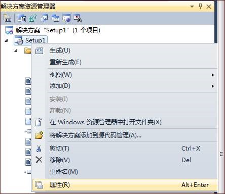 3、 在创建的项目名称(Setup1)上点击右键:属性