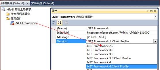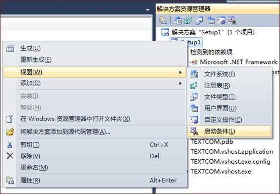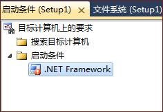 VS2010发布.NET2.0的版本,在创建安装程序时,需要设置启动条件:在项目名称(setup1)上,点击右键选择“视图”à“启动条件”: