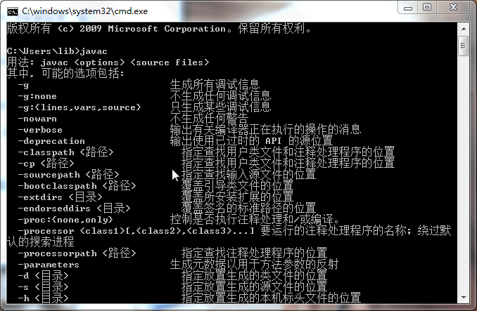 依次“开始”-->“运行”,键入“cmd”,键入命令“javac”,出现以下画面,说明环境变量配置成功。