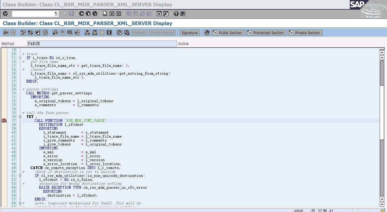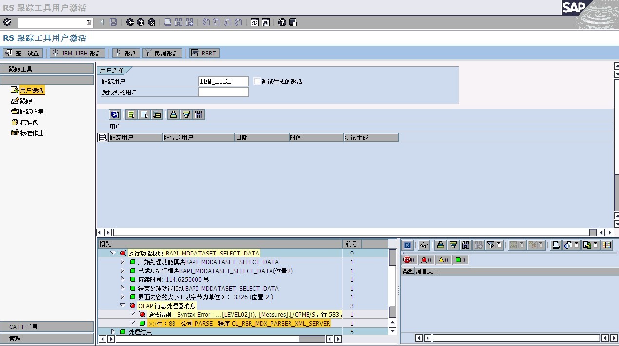 参考note899572,通过rstt来追踪BW MDX解析器的过程。首先激活当前的用户追踪,重现报错的过程,然后在跟踪中,就能看到程序运行到MDX解析的过程。虽然没有明细的MDX语句,但是已经有了报错的程序行数;