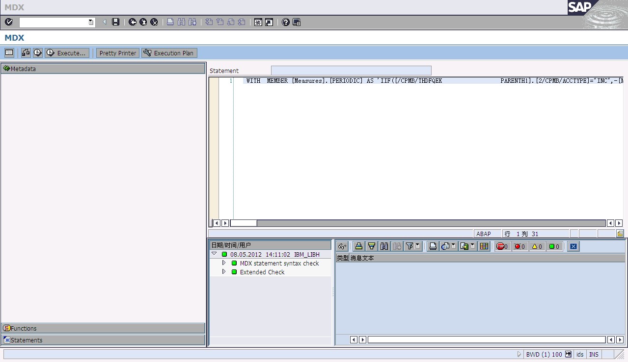 之后,进入MDXTEST,执行我们截取的MDX语句,会看到系统提示Syntax error。至此,可以判断出BW端解析并不识别这个BPC产生的MDX语句;