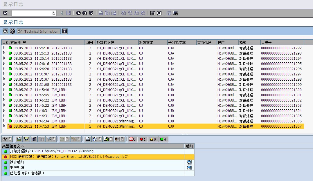 登录到BW后台,查看SLG1,可以看到刚刚报出的错误,但是这里也无法看到出错的MDX语句;