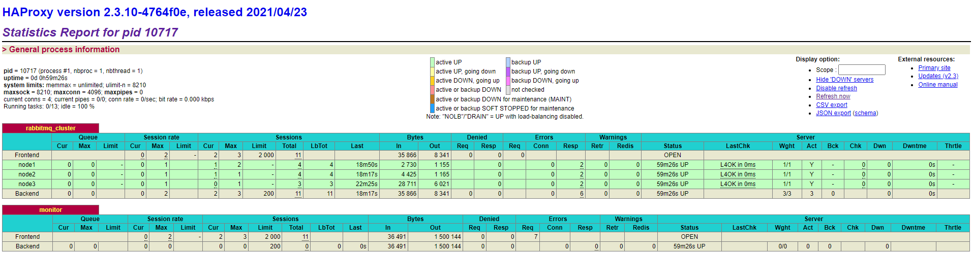 所有节点都为绿色,代表节点健康。此时证明 HAProxy 搭建成功,并已经对 RabbitMQ 集群进行监控。