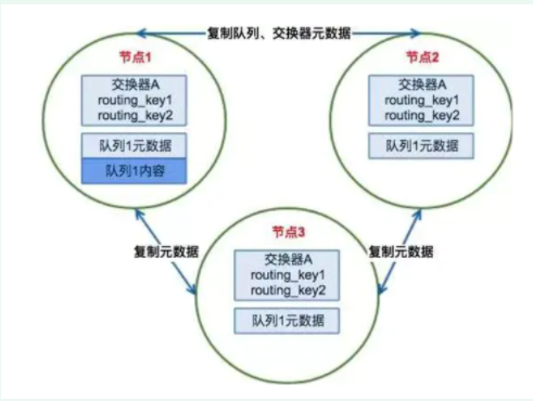 如果消息生产者所连接的是节点2或者节点3,此时队列1的完整数据不在该两个节点上,那么在发送消息过程中这两个节点主要起了一个路由转发作用,根据这两个节点上的元数据转发至节点1上,最终发送的消息还是会存储至节点1的队列1上。同样,如果消息消费者所连接的节点2或者节点3,那这两个节点也会作为路由节点起到转发作用,将会从节点1的队列1中拉取消息进行消费。