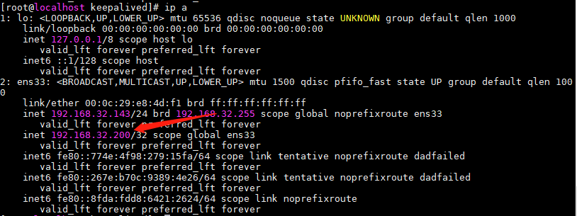 此时再次使用 ip a 分别查看,可以发现 142上的 VIP 已经漂移到 143上,情况如下: