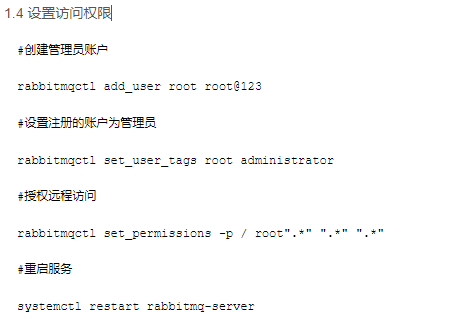 #创建管理员账户rabbitmqctl add_user root root@123#设置注册的账户为管理员rabbitmqctl set_user_tags root administrator#授权远程访问rabbitmqctl set_permissions -p / root".*" ".*" ".*"#重启服务systemctl restart rabbitmq-server