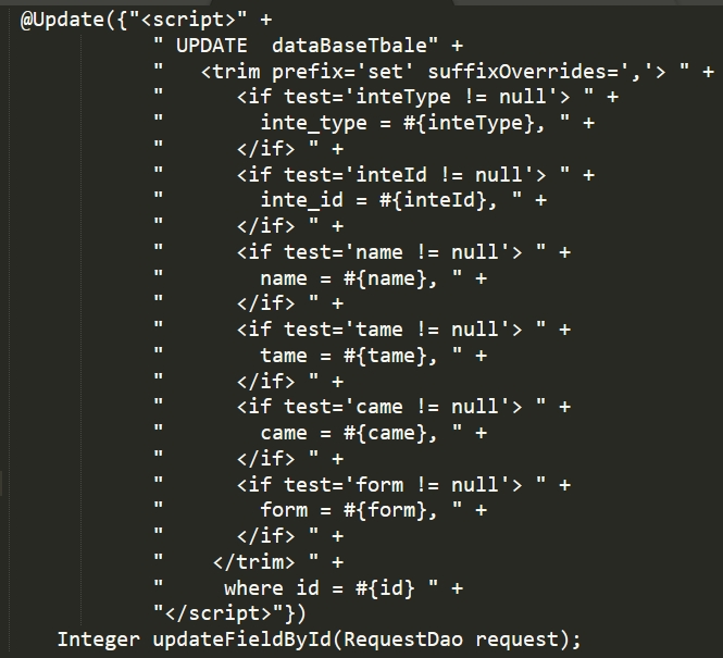 1 @Insert({"<script>" + 2 "insert into dataBseTable" + 3 " <trim prefix='(' suffix=')' suffixOverrides=','> " + 4 " <if test='type != null'> " + 5 " `type`, " + 6 " </if> " + 7 " <if test='dbName != null'> " + 8 " db_name, " + 9 " </if> " + 10 " </trim> " + 11 " <trim prefix='values (' suffix=')' suffixOverrides=','> " + 12 " <if test='type != null'> " + 13 " #{type,jdbcType=INTEGER}, " + 14 " </if> " + 15 " <if test='dbName != null'> " + 16 " #{dbName,jdbcType=VARCHAR}, " + 17 " </if> " + 18 " </trim>" + 19 "</script>"}) 20 @Options(useGeneratedKeys = true, keyProperty = "id") 21 Integer insertSelective(Data do);