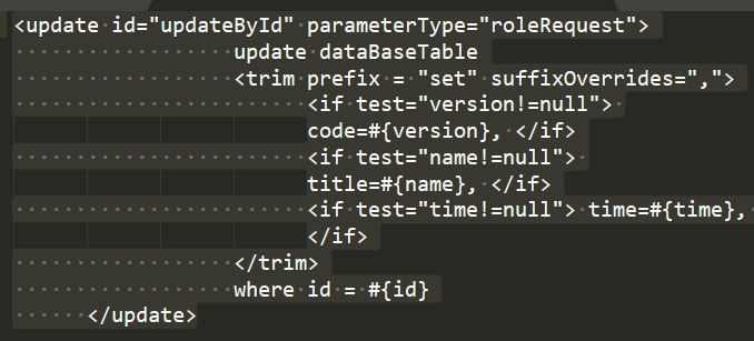 1 <insert id="insertTable" parameterType = "tableDao"> 2 INSERT INTO tableDaoa 3 <trim prefix="(" suffix=")" suffixOverrides=","> 4 <if test="id!=null"> id, </if> 5 <if test="time!=null"> time, </if> 6 </trim> 7 VALUES 8 <trim prefix="(" suffix=")" suffixOverrides=","> 9 <if test="id!=null"> #{id}, </if> 10 <if test="time!=null"> #{time}, </if> 11 </trim> 12 </insert>
