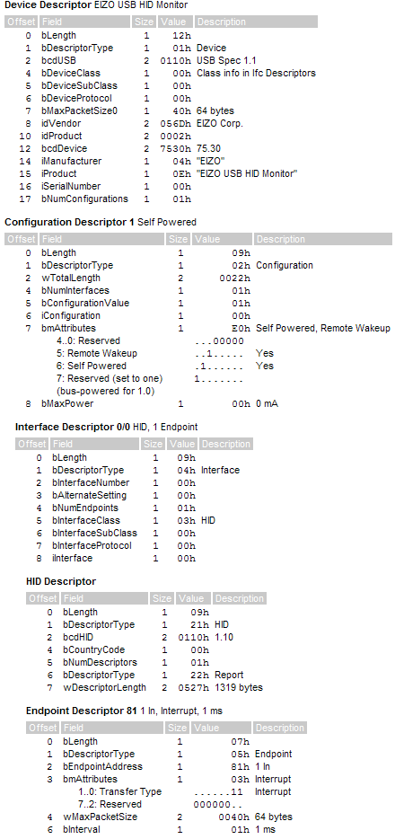 (只列出部分,因為 EIZO 定義了很多參數可調,整個 Descriptor 很長)