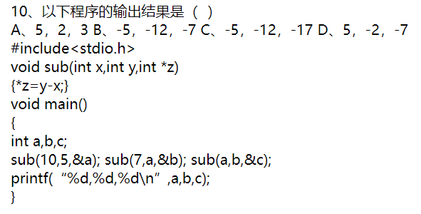 sub函数的作用是将形参y和x 的差赋值给了z指向的那个内存地址,所以sub(10,5,&a)10和5属于值传递,a是属于地址传递,也是a与z指向了一个存储单元,在执行函数后,a随*z变化