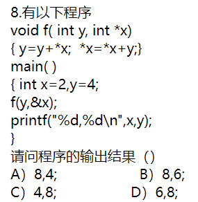 f函数中变量x传递的是变量地址,可以实现值变换,而变量y是传递的值,执行完f后,y的值是变了,但main函数中的y未变化,