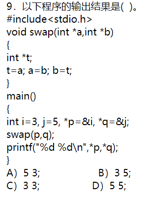 函数swap(int*a,int*b)的功能是实现*a和*b中两个数据的交换,在主函数中调用swap(p,q)后,,参形指针变量a和b指向i和j,在swap执行完后,分别指向j和i,而指针变量p和q所指向变量的值没有发生变化,所以输出结果为3,5