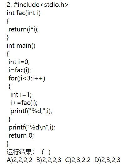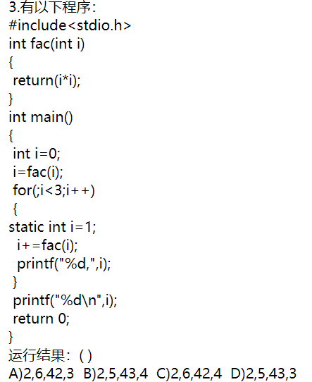 开始时,i=0,执行i=fac(i),i为0;for循环开始,i=0,后i=1,执行i+=fac(i),i=2;第二轮,i=1,后执行函数,i=6;第三轮,i=2,执行函数,i=36+6=42;第四轮i大于3跳出循环,打印i=3