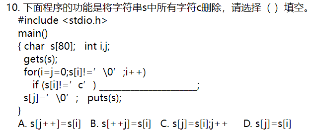 如果数组s中存储值与字符c相同,则i++直接跳过当前值,如果不相同,则将当前值赋予数组指定位置,并通过