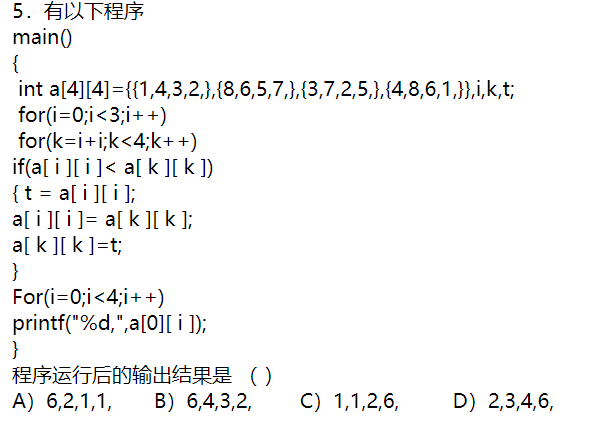 该程序实现对二维数据反对角线上的元素从大到小的排序,并输出排序后的数组第一行。外层循环变量i表示第i行第i列的数字,内层变量k表示第i+1行第i+1列的数字,if语句对相关数字进行比较交换,最后数组变为a[4][4]={{6,4,3,2,},{8,2,5,7,},{3,7,1,5,},{4,8,6,1,}},并将第一行输出