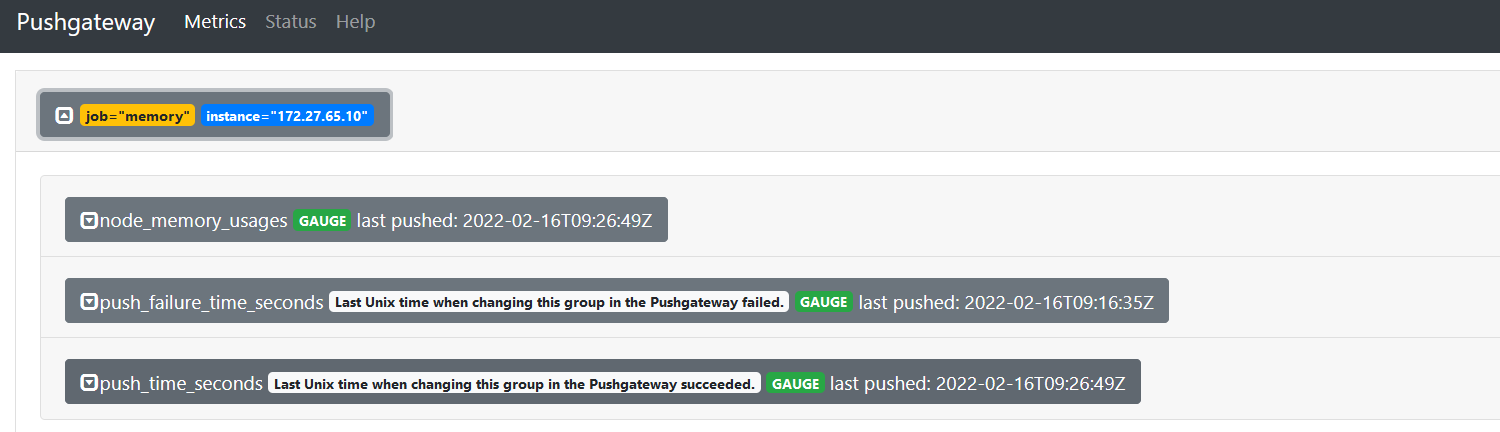 # 推送指定的数据格式到pushgateway # 将“metrics” 字节赋值 “3.6” ;向 {job="test_job"} 添加单条数据: echo "metric 3.6" | curl --data-binary @- http://172.27.65.10:9091/metrics/job/test_job