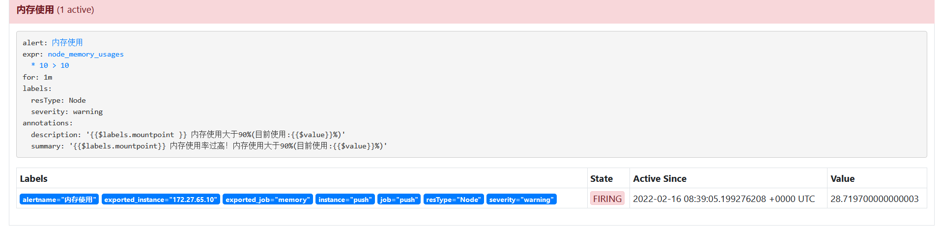 - alert: 内存使用 expr: node_memory_usages * 10 > 10 for: 1m labels: {resType: 'Node',severity: 'warning'} annotations: summary: "{{$labels.mountpoint}} 内存使用率过高!内存使用大于90%(目前使用:{{$value}}%)" description: "{{$labels.mountpoint }} 内存使用大于90%(目前使用:{{$value}}%)"
