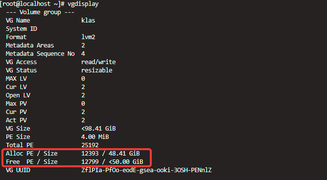 [root@localhost ~]# vgdisplay --- Volume group --- VG Name klas System ID Format lvm2 Metadata Areas 1 Metadata Sequence No 3 VG Access read/write VG Status resizable MAX LV 0 Cur LV 2 Open LV 2 Max PV 0 Cur PV 1 Act PV 1 VG Size 48.41 GiB PE Size 4.00 MiB Total PE 12393 Alloc PE / Size 12393 / 48.41 GiB Free PE / Size 0 / 0 VG UUID ZflPIa-PfOo-eodE-gsea-ooki-3OSH-PENnlZ