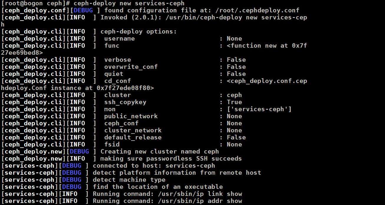 # 创建一个目录保存ceph配置及密钥 mkdir -p /data/services/ceph # 创建ceph cluster集群 cd /data/services/ceph ceph-deploy new services-ceph
