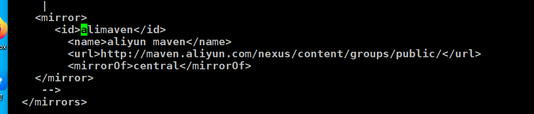 cd maven/conf vim settings.xml <mirror> <id>alimaven</id> <name>aliyun maven</name> <url>http://maven.aliyun.com/nexus/content/groups/public/</url> <mirrorOf>central</mirrorOf> </mirror>