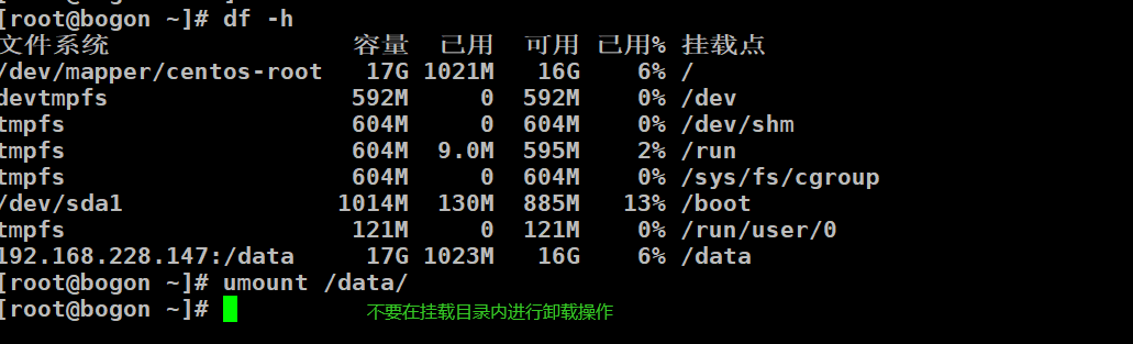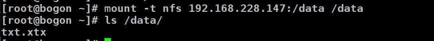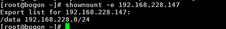 [root@bogon ~]# systemctl restart nfs [root@bogon ~]# showmount -e localhost Export list for localhost: /data 192.168.228.0/24