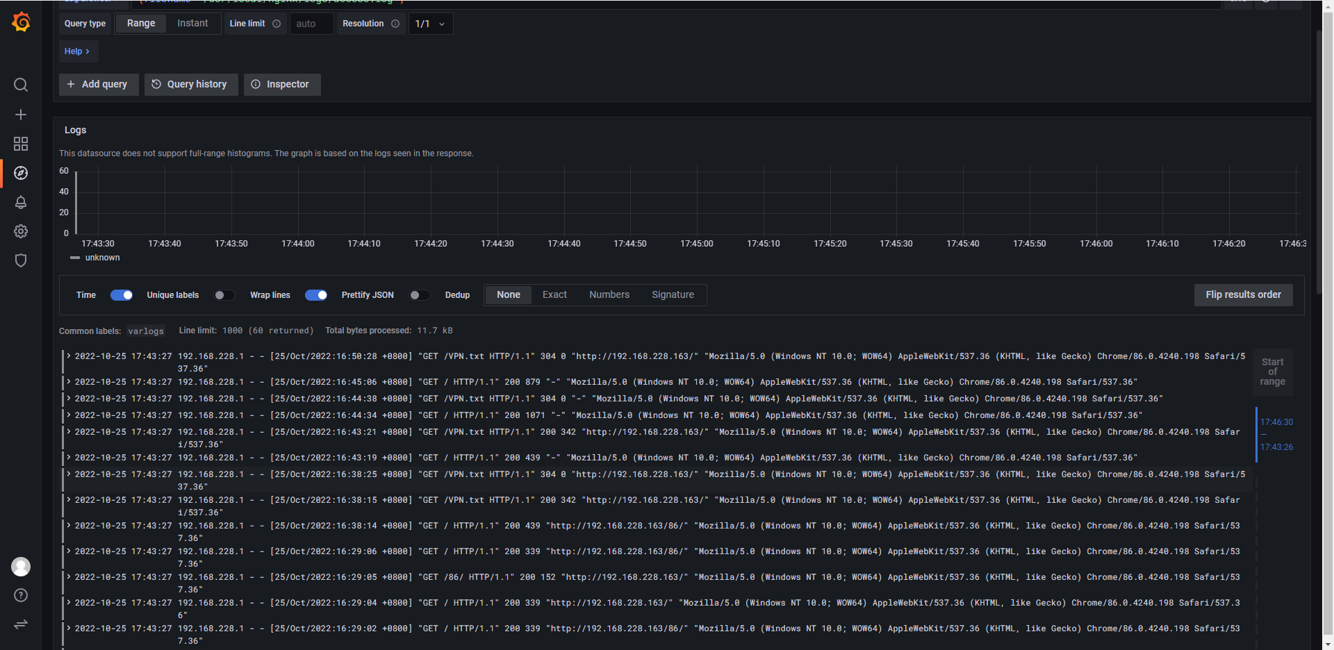 server: http_listen_port: 9080 grpc_listen_port: 0 positions: filename: /tmp/positions.yaml clients: - url: http://192.168.228.163:3100/loki/api/v1/push scrape_configs: - job_name: system static_configs: - targets: - localhost #本地 labels: job: varlogs #job任务 __path__: /usr/local/nginx/logs/*log #配置监控路径
