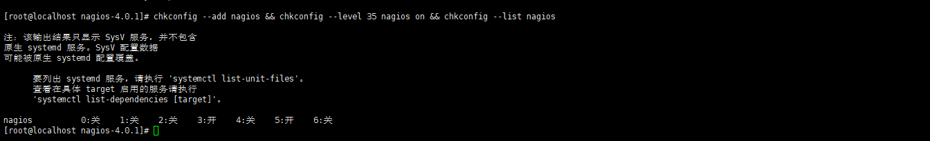 chkconfig --add nagios && chkconfig --level 35 nagios on && chkconfig --list nagios
