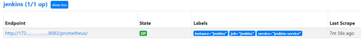 - job_name: "jenkins" metrics_path: "/prometheus/" scheme: http bearer_token: bearer_token static_configs: - targets: ['172.16.1.110:30009']