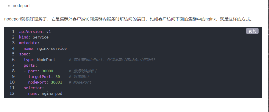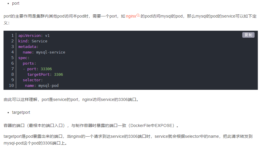 port是service端口,即k8s中服务之间的访问端口 targetport是pod(也就是容器)的端口 nodeport是容器所在node节点的端口,即外部机器可访问的端口。(通过nodeport类型的service暴露给集群节点)