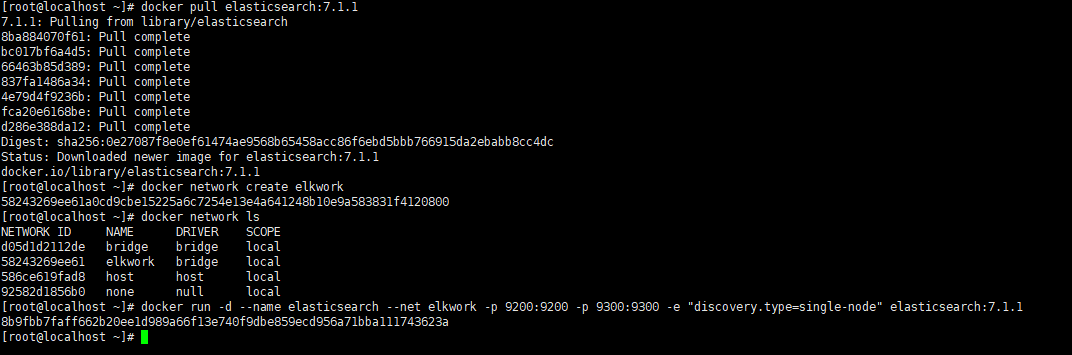 docker run -d --name elasticsearch --net elkwork -p 9200:9200 -p 9300:9300 -e "discovery.type=single-node" elasticsearch:7.1.1