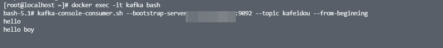 docker exec -it kafka sh 运行消费者,进行消息的监听 kafka-console-consumer.sh --bootstrap-server 192.168.1.60:9092 --topic kafeidou --from-beginning 打开一个新的ssh窗口,同样进入kafka的容器中,执行下面这条命令生产消息 kafka-console-producer.sh --broker-list 192.168.1.60(机器IP):9092 --topic kafeidou 输入完这条命令后会进入到控制台,可以输入任何想发送的消息,这里发送一个hello >> >hello > > > 可以看到,在生产者的控制台中输入消息后,消费者的控制台立刻看到了消息