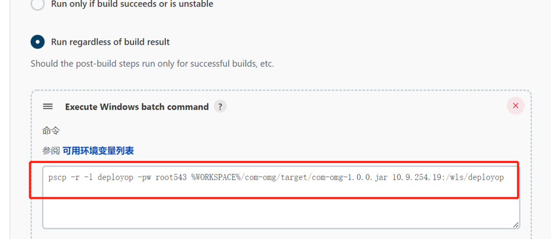 pscp -r -l root -pw root D:\jenkins\com-omg\target\com-omg-1.0.0.jar 192.168.20.200:/root/com-omg