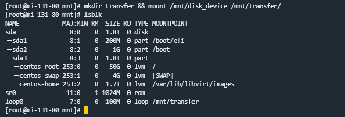[root@tudou mnt]# mkdir transfer && mount /mnt/disk_device /mnt/transfer/