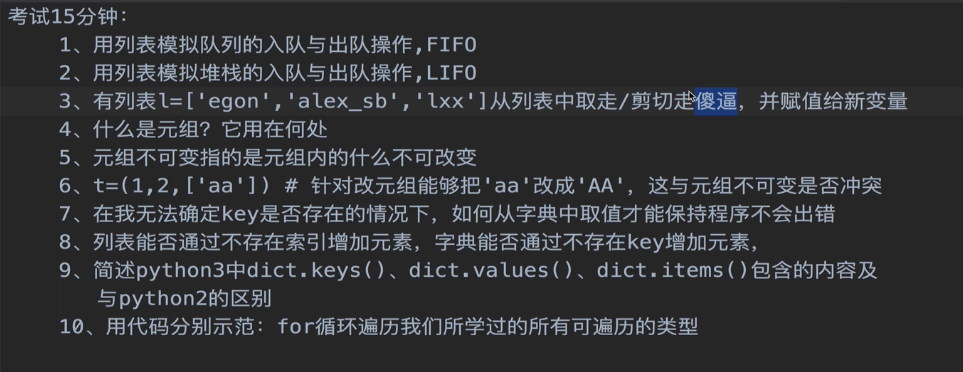 >>> l=['a','b',1,'a','a'] >>> s=set(l) >>> s # 将列表转成了集合 {'b', 'a', 1} >>> l_new=list(s) # 再将集合转回列表 >>> l_new ['b', 'a', 1] # 去除了重复,但是打乱了顺序 # 针对不可变类型,并且保证顺序则需要我们自己写代码实现,例如 l=[ {'name':'lili','age':18,'sex':'male'}, {'name':'jack','age':73,'sex':'male'}, {'name':'tom','age':20,'sex':'female'}, {'name':'lili','age':18,'sex':'male'}, {'name':'lili','age':18,'sex':'male'}, ] new_l=[] for dic in l: if dic not in new_l: new_l.append(dic) print(new_l) # 结果:既去除了重复,又保证了顺序,而且是针对不可变类型的去重 [ {'age': 18, 'sex': 'male', 'name': 'lili'}, {'age': 73, 'sex': 'male', 'name': 'jack'}, {'age': 20, 'sex': 'female', 'name': 'tom'} ]
