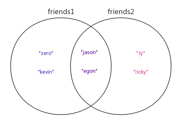 friends2 = {"Jy","ricky","jason","egon"} # 用户2的好友们