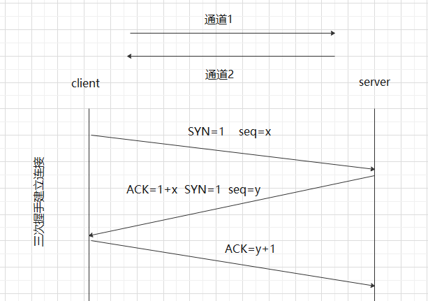 SYN=1表示请求建立连接, ACK=1+x, 其中1表示同意建立连接, 其中x与seq中的x相对应, 表示回复的消息适用于上一个请求.