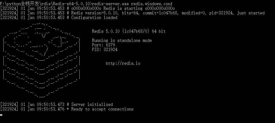 如果想方便的话,可以把 redis 的路径加到系统的环境变量里,这样就省得再输路径了,后面的那个 redis.windows.conf 可以省略,如果省略,会启用默认的。输入之后,会显示如下界面: