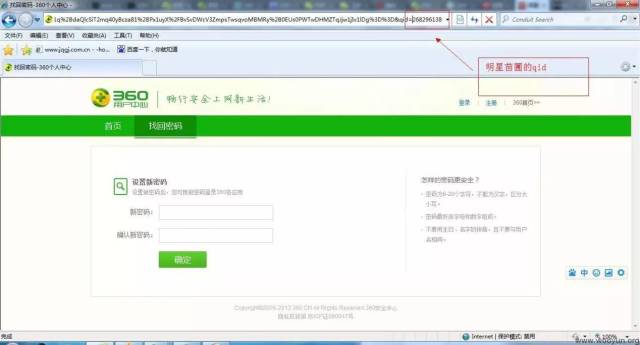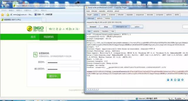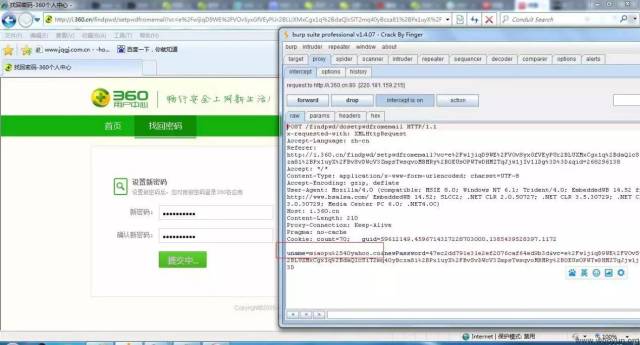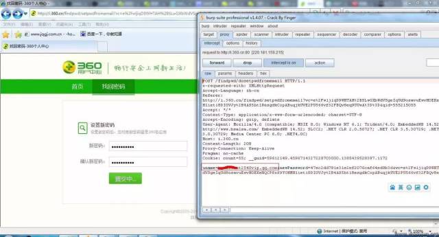 而且这里还发现,我们在知道邮箱,不知道 qid 的情况下,也可以修改密码:首先用自己的账号获取一个 360 找回密码的 URL,然后在修改密码时截包。