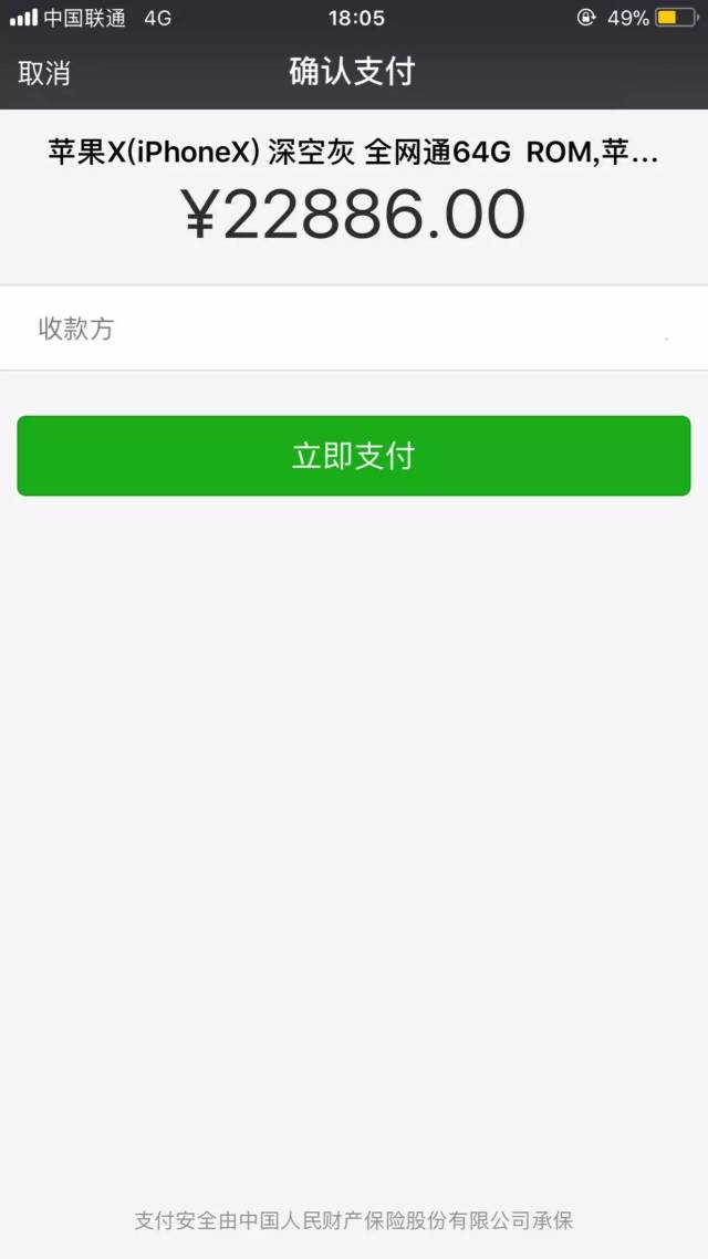 不过这里我只想让这台价值八千的 iPhone X 变成 0.01 购买,那么我们放包,进入支付页面。