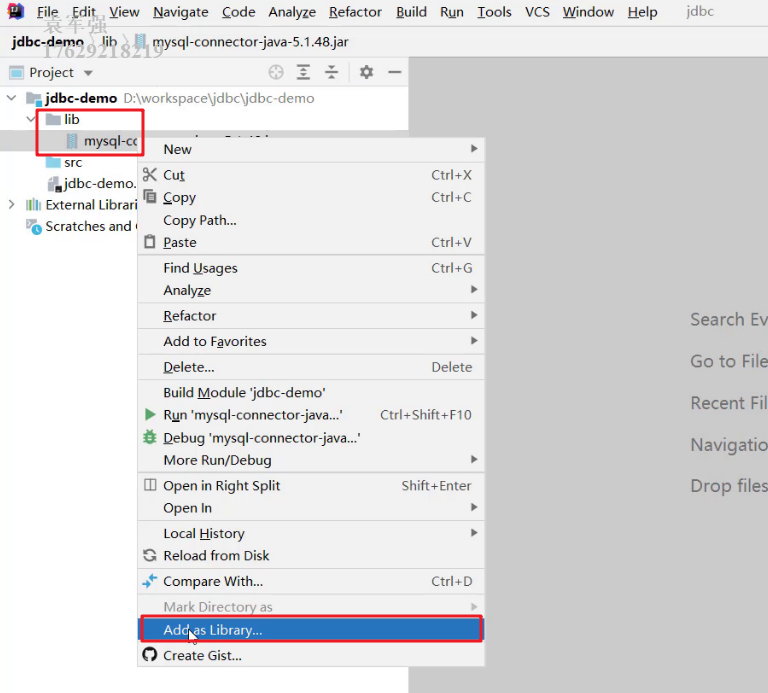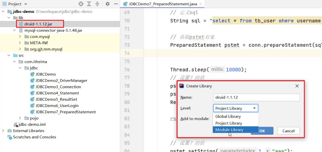 将mysql的驱动包放在模块下的lib目录(随意命名)下,并将该jar包添加为库文件