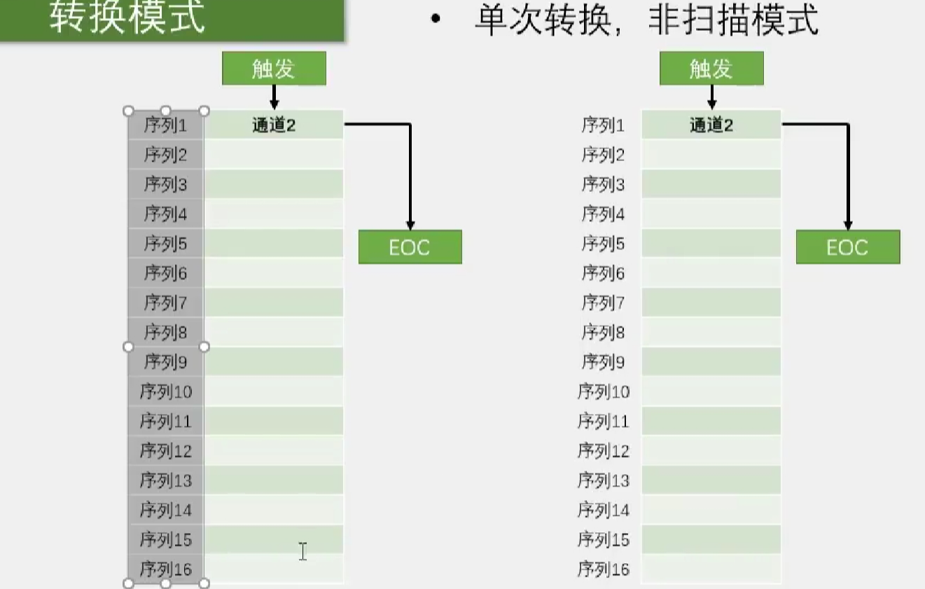 触发开始转换的信号有两种,一种是软件触发,即在程序中手动调用代码,开始转换。另一种是硬件触发
