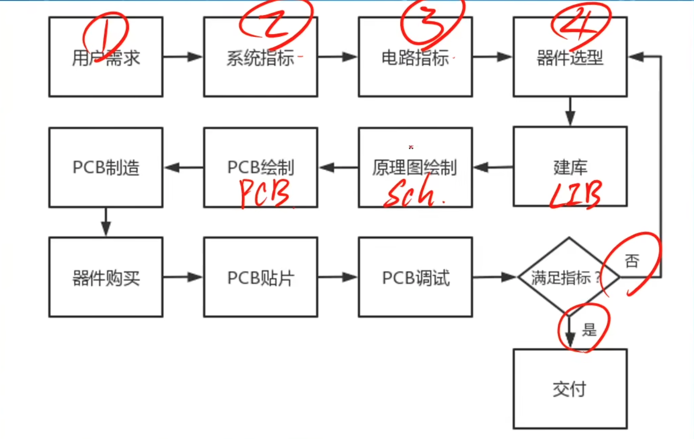 导入原理图、建立规则、器件布局、布线(连线、覆铜)、检查