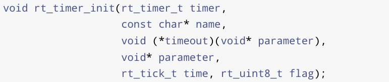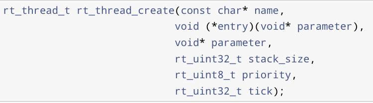 rt_err_t rt_thread_init(struct rt_thread* threadconst char* name, void (*entry)(void* parameter), void* parameter, void* stack_start, rt_uint32_t stack_size, rt_uint8_t priority, rt_uint32_t tick);
