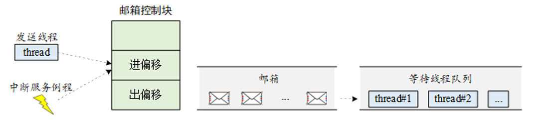 当一个线程向邮箱发送邮件时,如果邮箱没满,将把邮件复制到邮箱中。如果邮箱已经满了,发送线 程可以设置超时时间,选择等待挂起或直接返回-RT_EFULL。如果发送线程选择挂起等待,那么当邮箱中的邮件被收取而空出空间来时,等待挂起的发送线程将被唤醒继续发送。