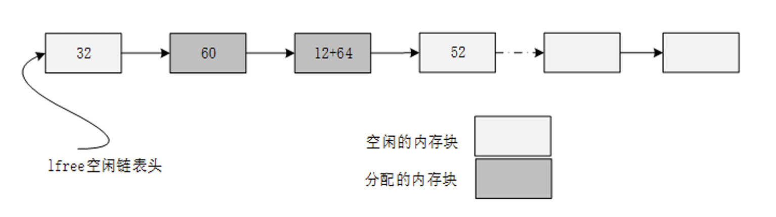 如下图所示的内存分配情况,空闲链表指针lfree初始指向32字节的内存块。当用户线程要再分配一 个64字节的内存块时,但此lfree指针指向的内存块只有32字节并不能满足要求,内存管理器会继续寻 找下一内存块,当找到再下一块内存块,128字节时,它满足分配的要求。因为这个内存块比较大,分配 器将把此内存块进行拆分,余下的内存块(52字节)继续留在lfree链表中,分配之后如下图所示。
